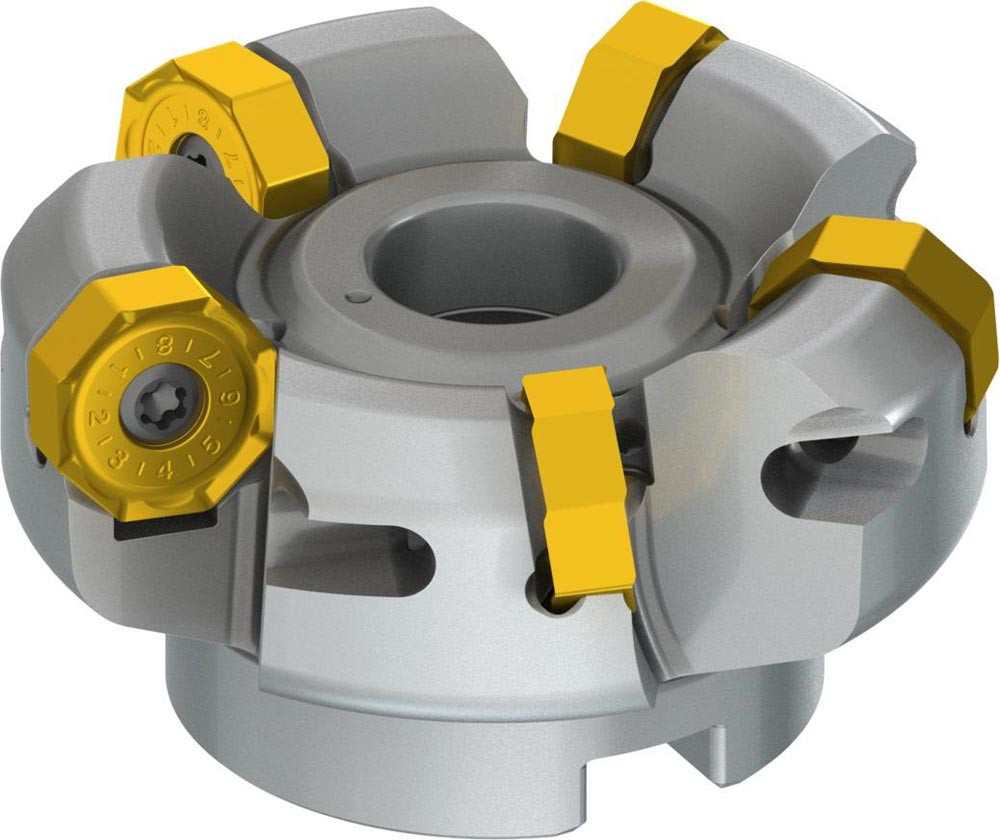 Planfräser mit doppelt negativer Geometrie welche 5 aus ONMX 0605.. · ONMX 0605..-W oder SNMX 1705.. doppelseitige Wendeschneidplatte · Schneiddurchmesser 63mm bis maximal 73,8mm mit 43° Anfahrwinkel und 22mm Bohrung gemäß DIN 8030-A · 40mm funktional und · durchgehende Kühlung und ungleicher Teilung zum Planfräsen und Entgratenmit einer maximalen Schnitttiefe von ON.. 4mm · SN.. 7mm