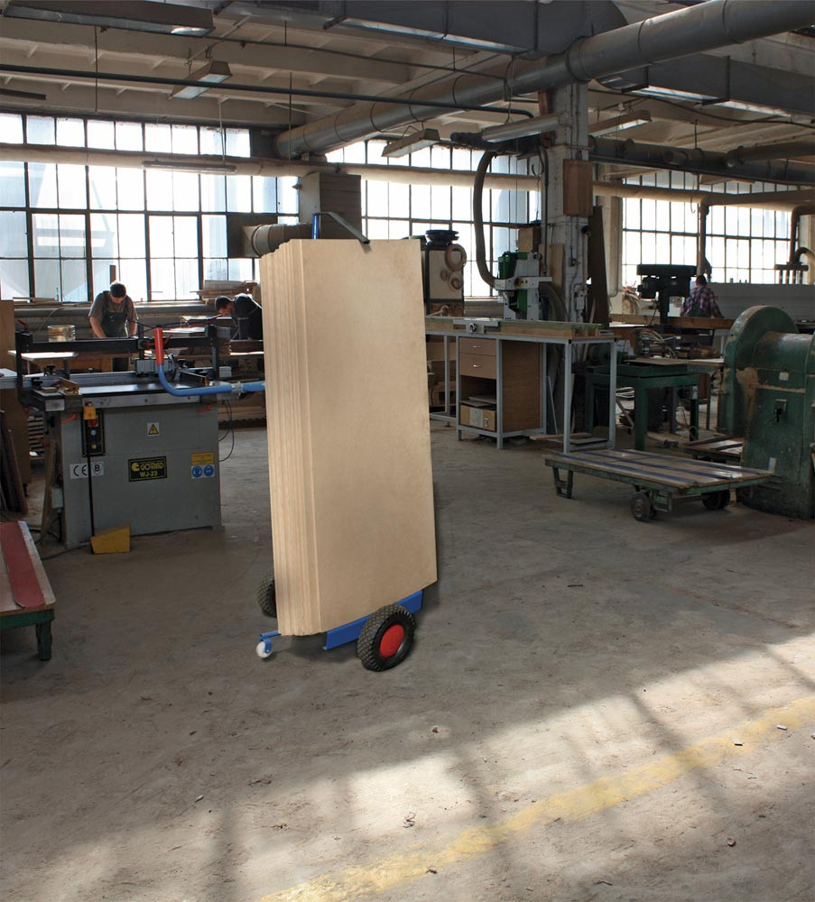 · Zum Längstransport von großflächigen Holz- und Kunststoffplatten · Stabile Schweißkonstruktion · Schaufelblech zum Stützbügel hin abfallend auf die Unterkonstruktion geschweißt · RAL 5010 enzianblau pulverbeschichtet · Schlag- und kratzfest · Stahlblechfelgen mit Präzisions-Rillenkugellager