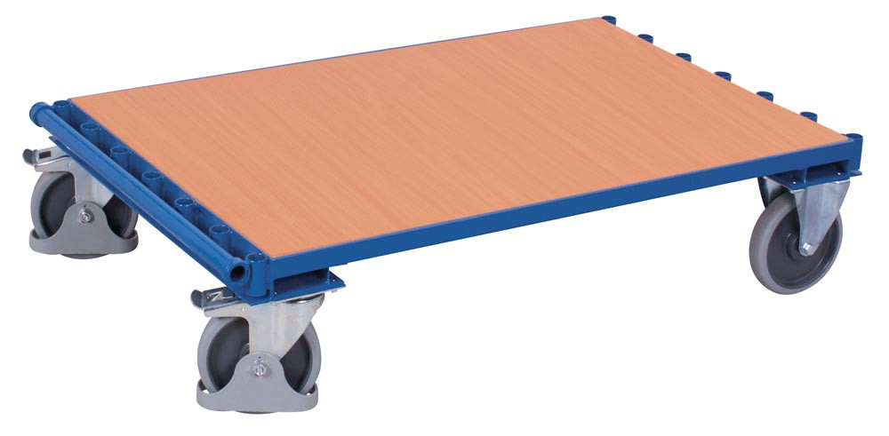 · Stabile Schweißkonstruktion · 7 Einsteckmöglichkeiten für Einsteckbügel (Bügelabstand licht 85 mm) ·Einsteckbügel aus Stahlrohr (Nicht im Lieferumfang enthalten) ∙ Ladefläche aus Holzwerkstoffplatte mit Buchendekor · RAL 5010 enzianblau pulverbeschichtet · Schlag- und kratzfest · 2 Lenk- und 2 Bockrollen · Lenkrollen gem. DIN EN 1757-3 mit Radfeststeller ∙ Bereifung: bei Traglast 500 kg thermoplastisches Vollgummi mit Präzisions-Rillenkugellager, bei Traglast 1200 kg ∙ Elastik-Vollgummi mit Kugellager