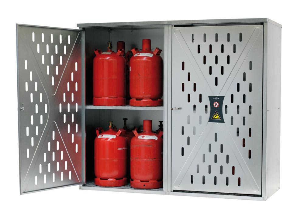 Propangasflaschen-Schrank, verzinkt, mit gelochten Front- und Seitenwänden, mit 2-flügeliger Tür, BxTxH 1680x690x1500 mm
