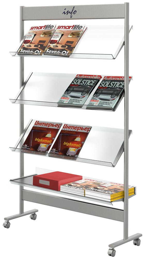 Prospektregal aus Stahl, 4 Böden aus Acrylglas für 12 x DIN A4, BxTxH 710x350x1600 mm, fahrbar, alusilber EP551574