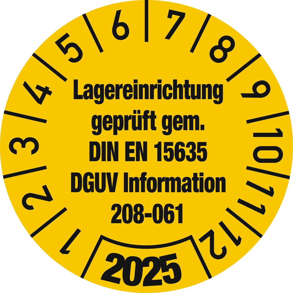 Prüfplakette, Lagereinrichtung geprüft 2025, Durchm. 30 mm, Folie, gelb, VE 10 Stück, Mindestabnahme 10 VE