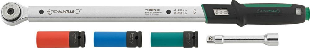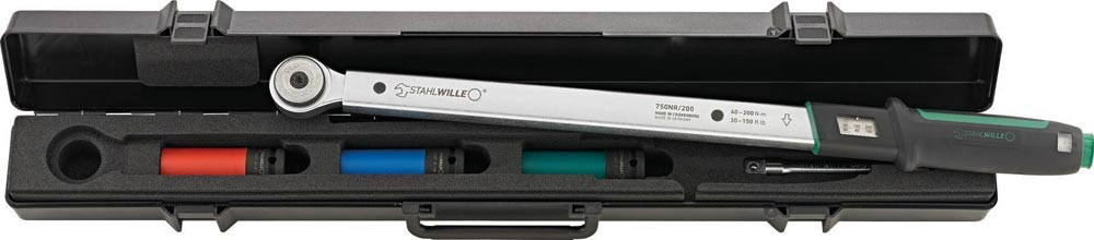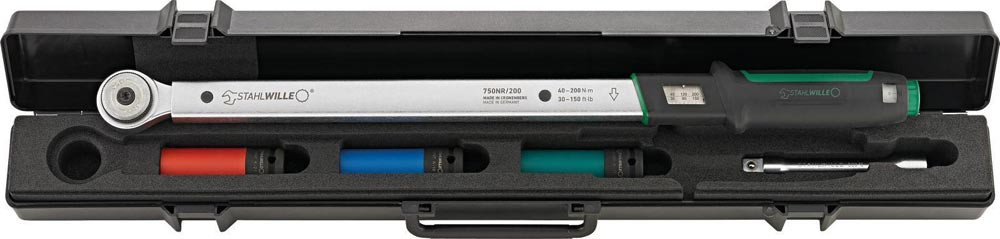 SEVENFIVEZERO-Drehmomentschlüssel mit 1/2″ Feinzahnknarre (60 Zähne) sowie 3 Radmuttern-Steckschlüsseleinsätze (SW 17, 19, 21) mit Kunststoffhülse zum Schutz empfindlicher Felgen · Auslösung über hör- und fühlbares Signal („Klick“) bei Erreichen des voreingestellten Werts. Einstellung über Drehknopf am Griffende (1 Umdrehung = 10 Nm) · Steckschlüsseleinsätze mit Kugelarretierung für sichere Kraftübertragung – auch bei tiefliegenden Verbindungen · präzise Einstellung über QuickSelect-Schnellverstellung · Auslösemechanismus ist unempfindlich gegenüber Weiter- und Gegenbelastung (bis zur Messbereichsgrenze) · Fixierung des Sollmoments durch Rastung, sofort einsatzbereit nach Entlastung. Doppelskala Nm/ft·lb · Anzeigeabweichung: ± 4 % · Kalibrierschein gemäß DIN EN ISO 6789-2:2017 · Kalibrierung kompatibel mit perfectControl®-System