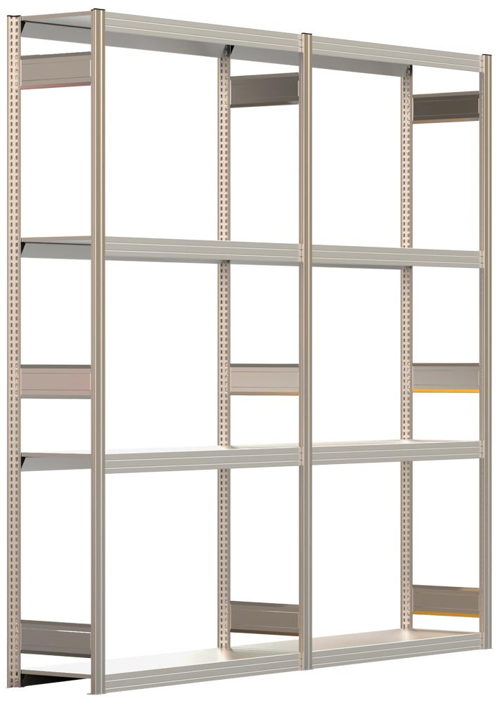 Räderregal-Set, Stecksystem, 1 x Grundfeld + 1 x Anbaufeld, verzinkt, für Kompletträder, BxTxH 2570x400x2500 mm, 4 Ebenen Stufenbalken, Fachl. 250 kg
