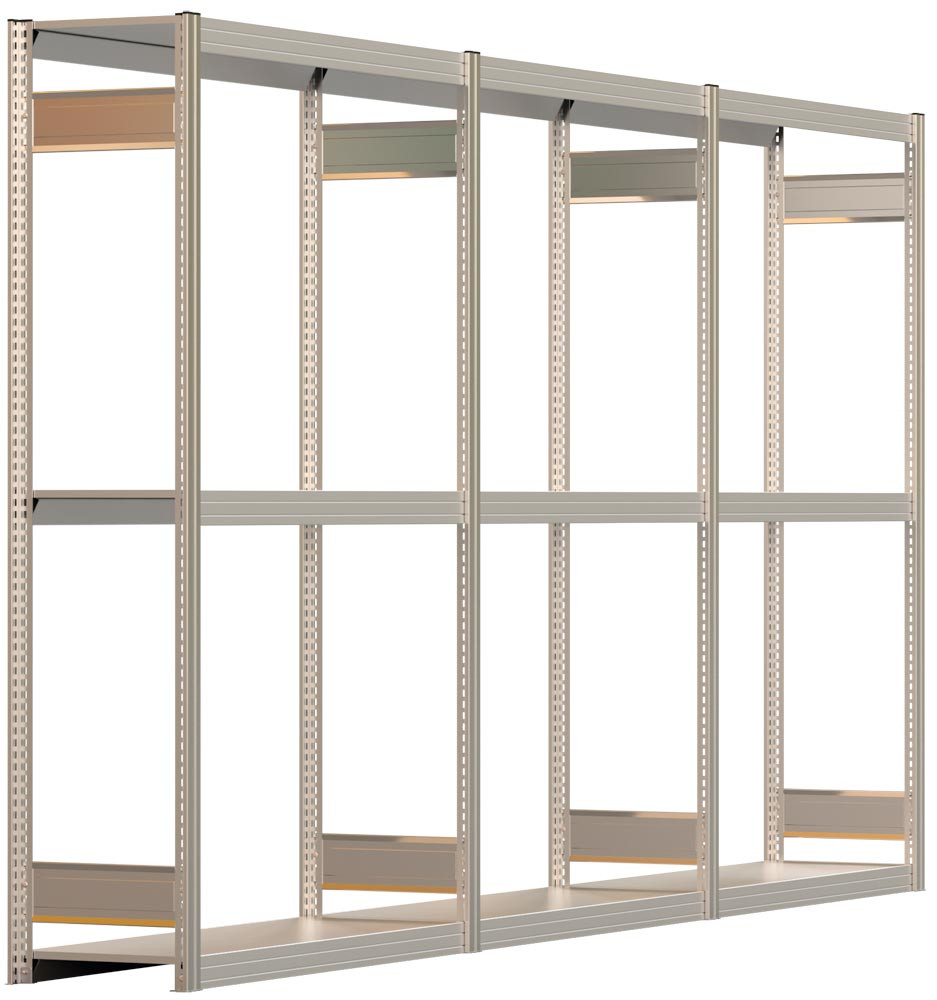 Räderregal-Set, Stecksystem, 1 x Grundfeld + 2 x Anbaufeld, verzinkt, für Kompletträder, BxTxH 3855x400x2000 mm, 3 Ebenen Stufenbalken, Fachl. 250 kg