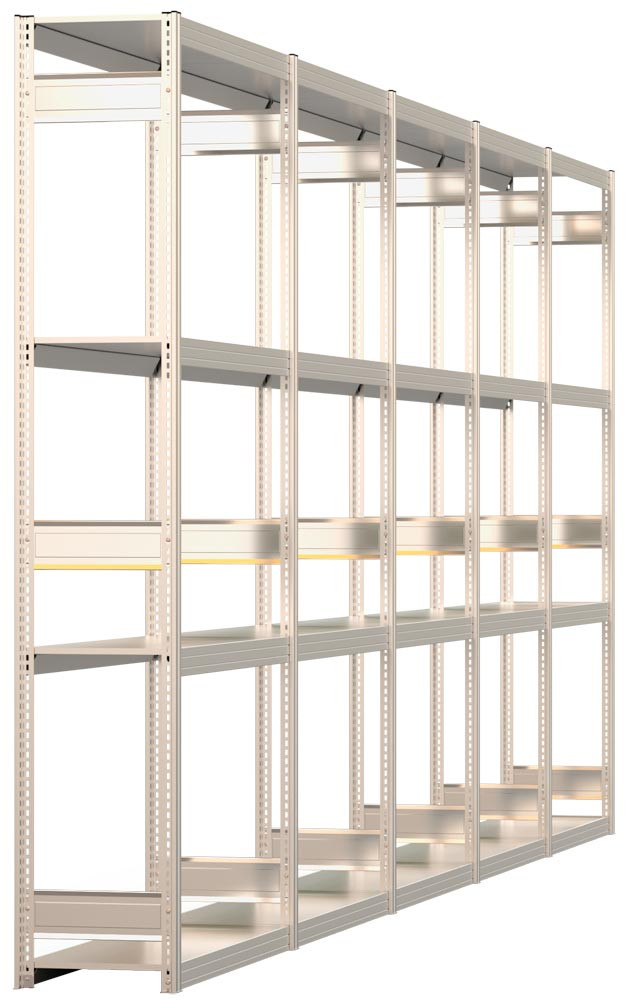 Räderregal-Set, Stecksystem, 1 x Grundfeld + 4 x Anbaufeld, verzinkt, für Kompletträder, BxTxH 6425x400x2500 mm, 4 Ebenen Stufenbalken, Fachl. 250 kg
