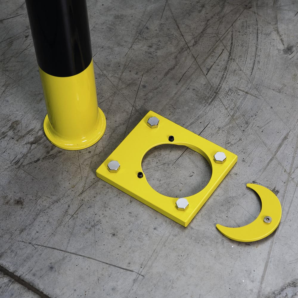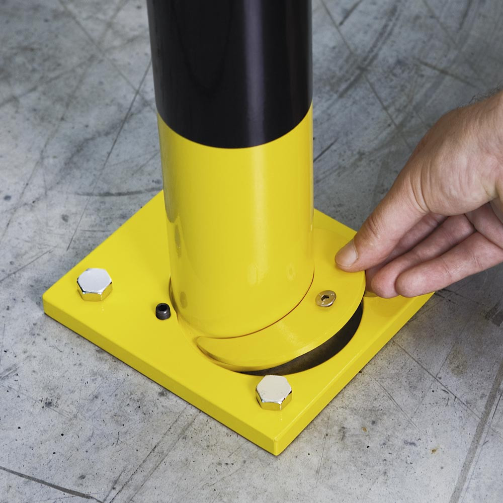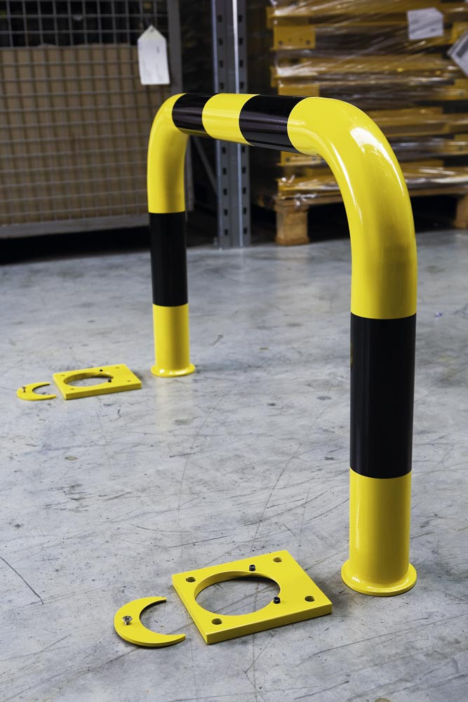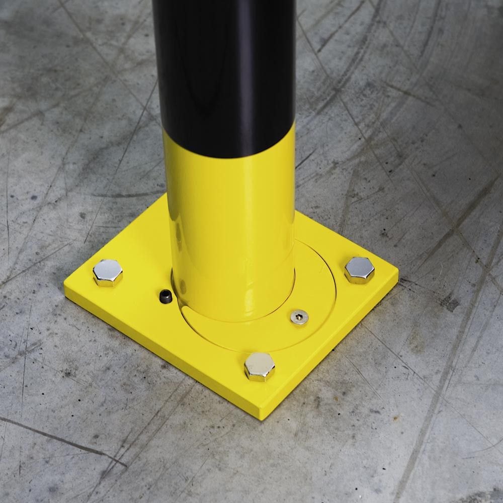 · Rohrdurchmesser 76 mm · Wandstärke 3 mm · Entfernbar mittels spezieller Bodenplatte · Erspart das aufwendige Demontieren von festen Rammschutzbügeln · Auch für Bereiche mit hohem Beschädigungsrisiko, da leicht austauschbar · Gelb mit schwarzen Signalstreifen · Kunststoffbeschichtet für den Inneneinsatz