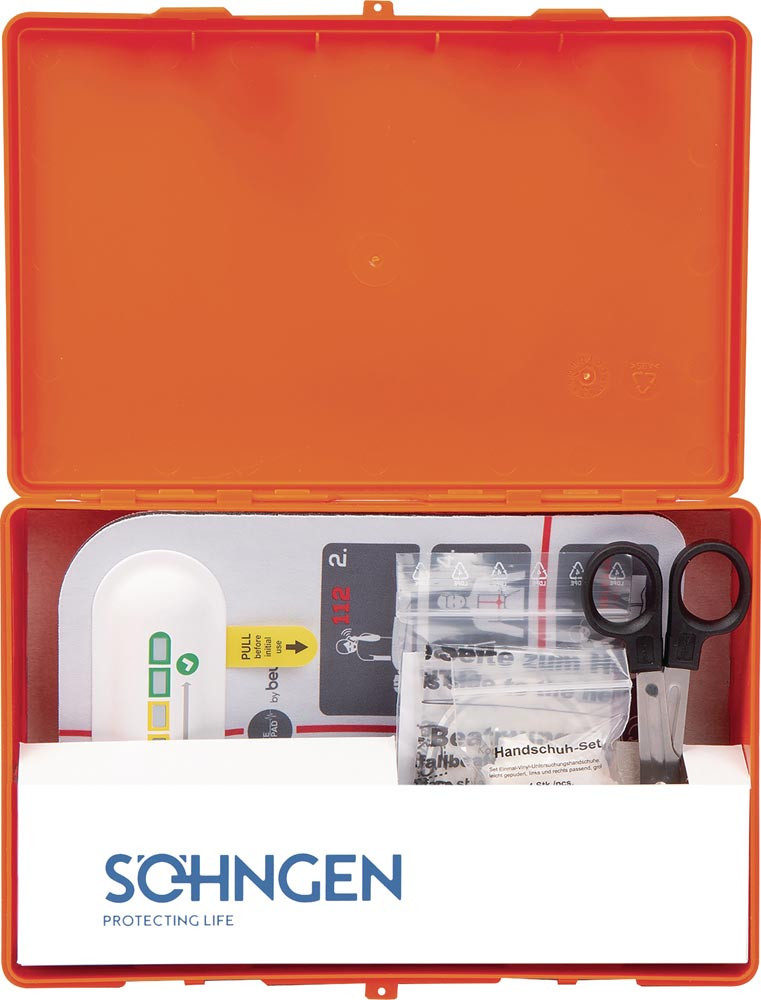 Inhalt: 1 x LifePad®, 1x SÖHNGEN Beatmungstuch, 1 x Handschuh-Set mit 4 Stück Vinyl Schutzhandschuhen groß, 1 x Kleiderschere