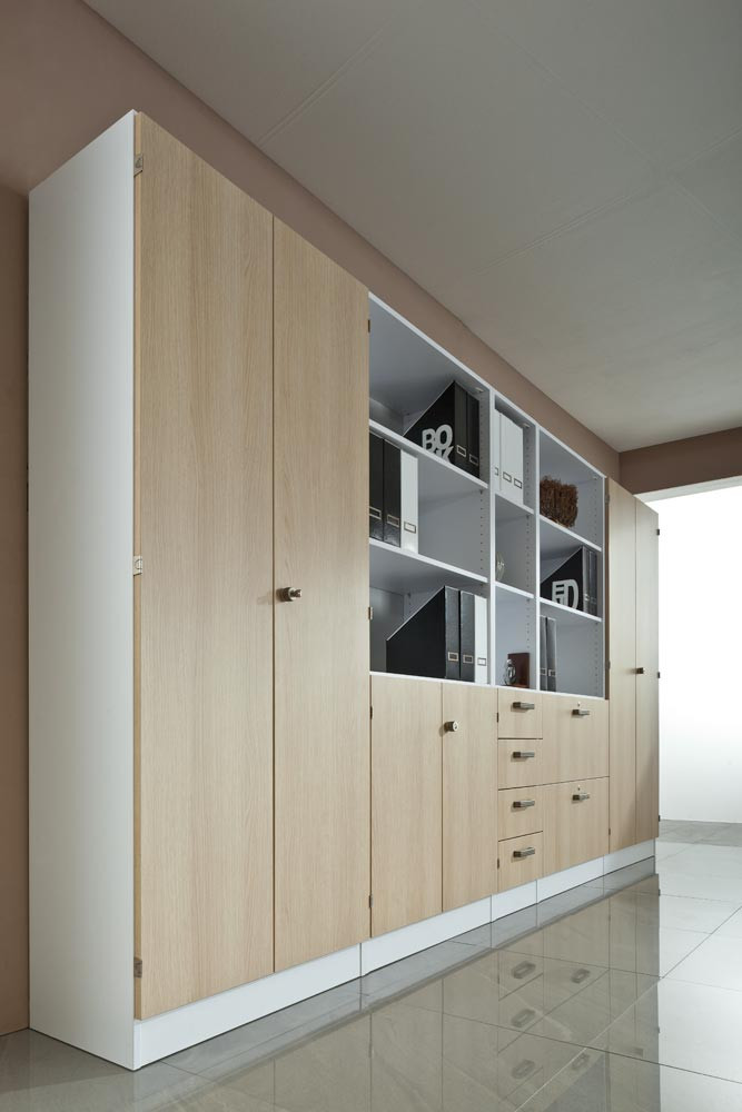 Regalschrank, BxTxH 406x420x2004 mm, 5 OH, 2 Böden, 4 Schubladen, weiß/eiche
