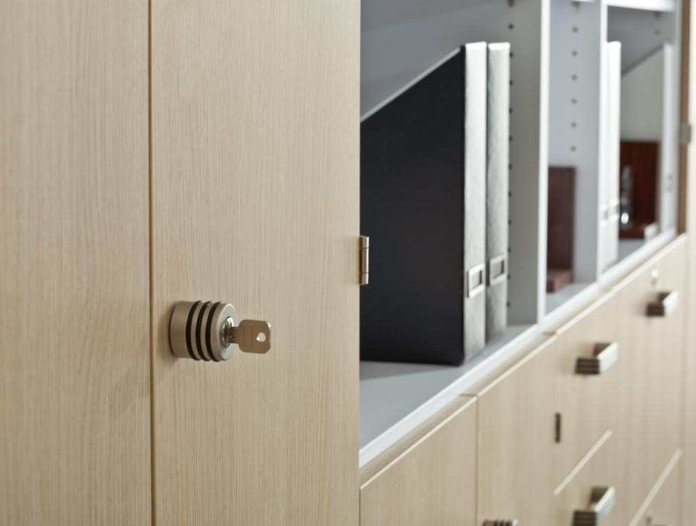 ∙ Beidseitig melaminharzbeschichtete Oberflächen, blend- und reflexfrei, abriebfest und pflegeleicht ∙ Von oben verstellbare Sockelfüße zum Ausgleich von Bodenunebenheiten ∙ Hochwertige Metallbeschläge für höchste Beanspruchung · Streifengriff
