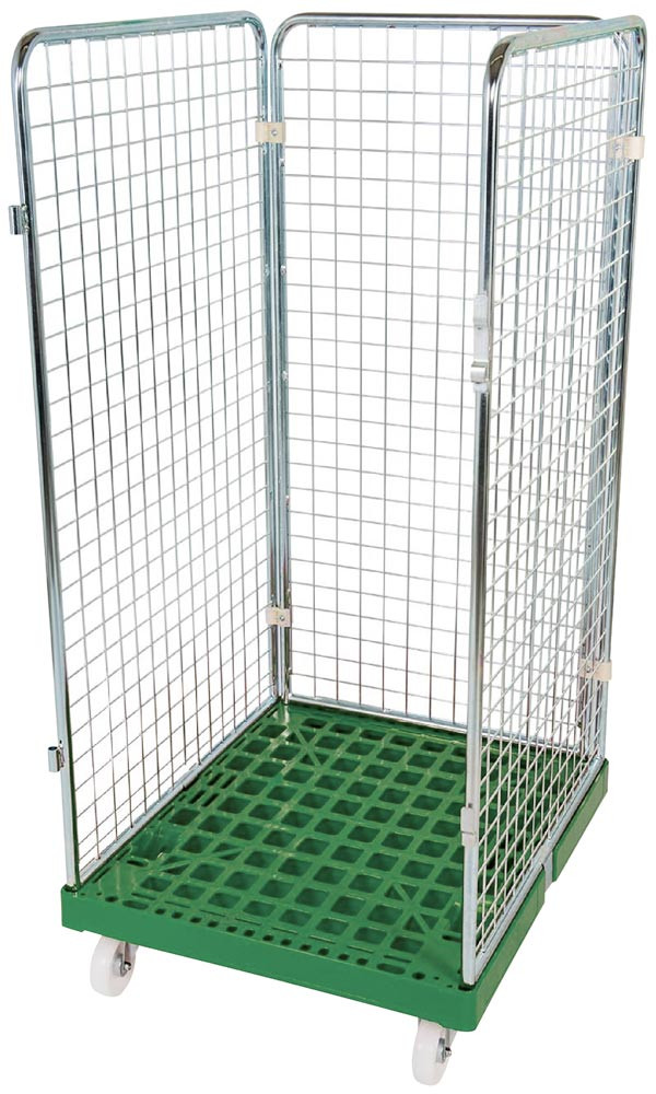 Rollbox mit Drahtgitterwänden, 3-seitig, Nutzhöhe 1350 mm, LxBxH 810x720x1500 mm, Bodenplatte aus HDPE, RAL 6024 verkehrsgrün