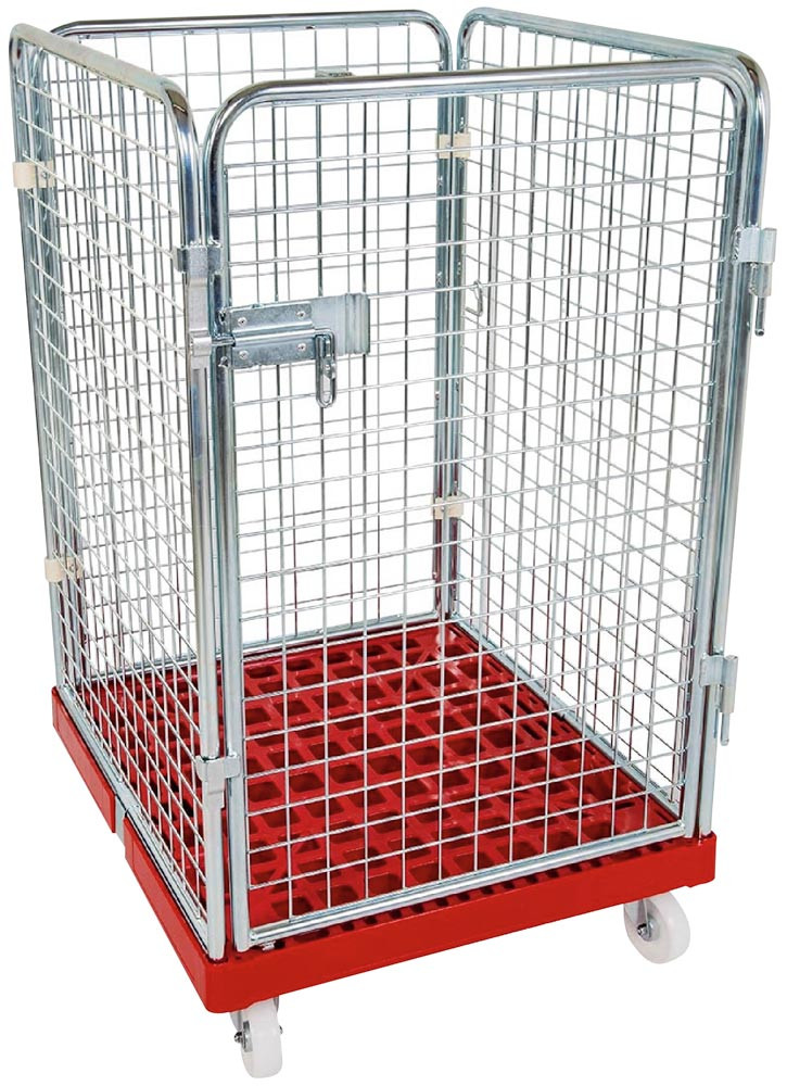 Rollbox mit Drahtgitterwänden, 4-seitig (1 Tür), Nutzhöhe 1020 mm, LxBxH 810x720x1200 mm, Bodenplatte aus HDPE, RAL 3000 feuerrot