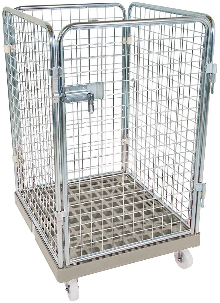 Rollbox mit Drahtgitterwänden, 4-seitig (1 Tür), Nutzhöhe 1020 mm, LxBxH 810x720x1200 mm, Bodenplatte aus HDPE, RAL 7032 kieselgrau