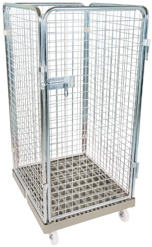 Rollbox mit Drahtgitterwänden, 4-seitig (1 Tür), Nutzhöhe 1350 mm, LxBxH 810x720x1500 mm, Bodenplatte aus HDPE, RAL 7032 kieselgrau