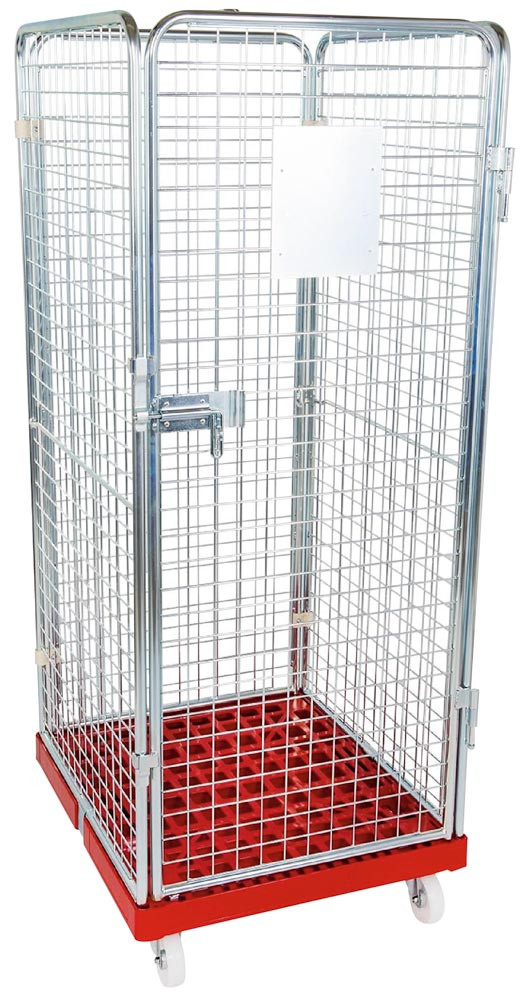 Rollbox mit Drahtgitterwänden, 4-seitig (1 Tür), Nutzhöhe 1585 mm, LxBxH 810x720x1800 mm, Bodenplatte aus HDPE, RAL 3000 feuerrot