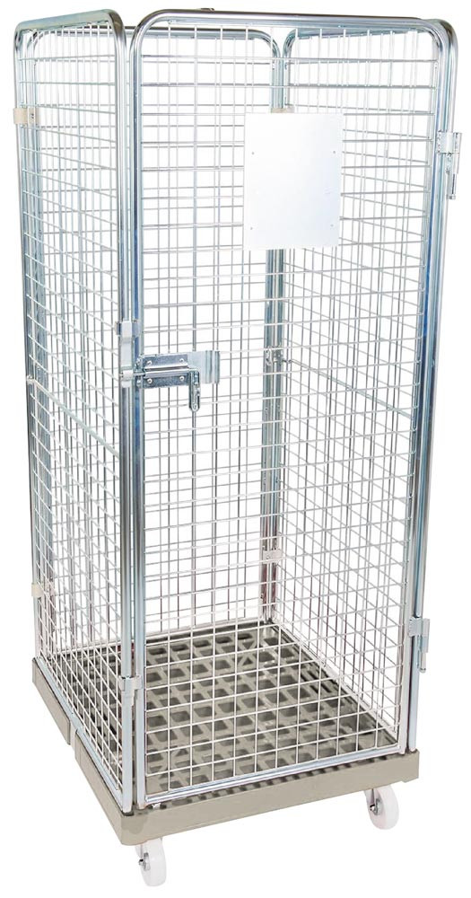 Rollbox mit Drahtgitterwänden, 4-seitig (1 Tür), Nutzhöhe 1585 mm, LxBxH 810x720x1800 mm, Bodenplatte aus HDPE, RAL 7032 kieselgrau