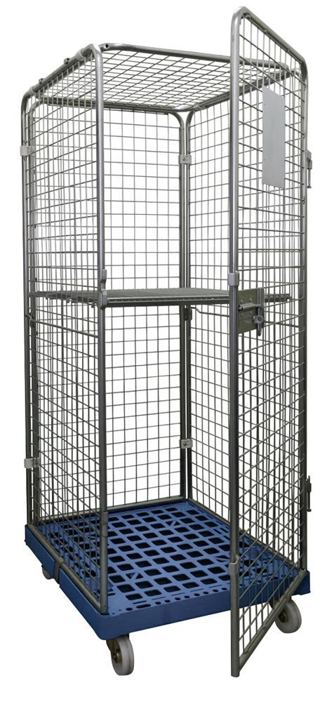 Rollbox mit Drahtgitterwänden, 5-seitig (1 Tür), 1 Boden, Nutzhöhe 1585 mm, LxBxH 810x720x1800 mm, Bodenplatte aus HDPE, RAL 5012 lichtblau