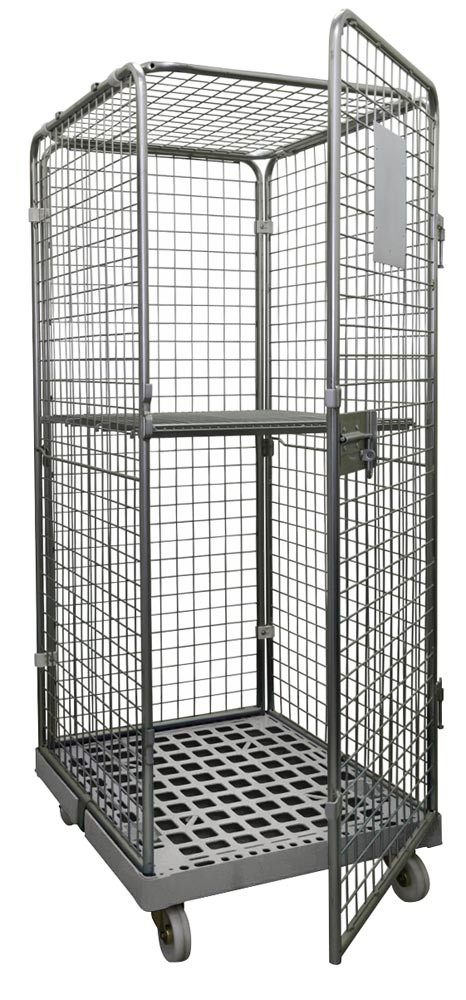 Rollbox mit Drahtgitterwänden, 5-seitig (1 Tür), 1 Boden, Nutzhöhe 1585 mm, LxBxH 810x720x1800 mm, Bodenplatte aus HDPE, RAL 7032 kieselgrau