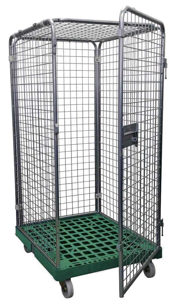 Rollbox mit Drahtgitterwänden, 5-seitig (1 Tür), Nutzhöhe 1350 mm, LxBxH 810x720x1500 mm, Bodenplatte aus HDPE, RAL 6024 verkehrsgrün