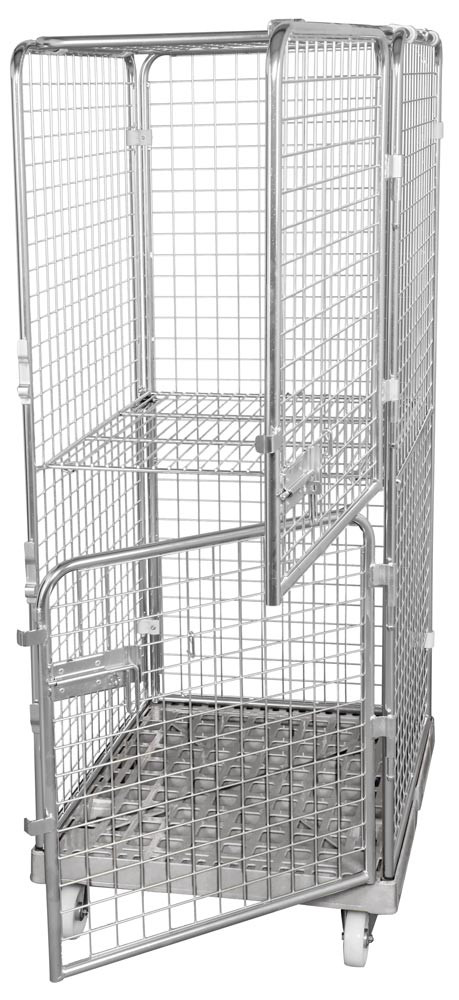 Rollbox mit Drahtgitterwänden, 5-seitig (2 Türen), 1 Boden, Nutzhöhe 1585 mm, LxBxH 810x720x1800 mm, Bodenplatte aus HDPE, RAL 7032 kieselgrau