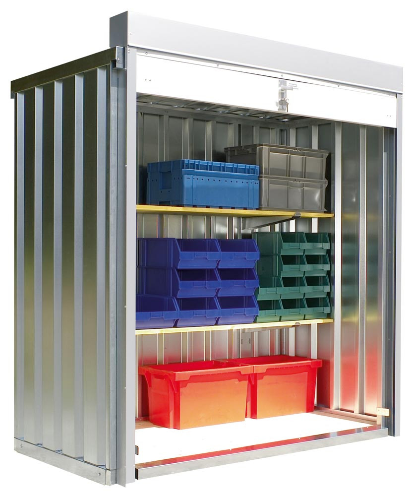 ∙ Als Materiallager und zur Mülltonnenunterbringung (geeignet für 3 Stück 120/240 l Mülltonnen) ∙ Platzsparend durch Rollladen anstelle Türen ∙ Vielfältiges Zubehör ∙ Optionales Elektroinstallationspaket für Beleuchtung ∙ Sicherungskasten bei Verwendung mehrerer Stromkreise empfohlen ∙ CE-Kennzeichnung mit Leistungserklärung für Standsicherheitsnachweis nach Eurocode 3