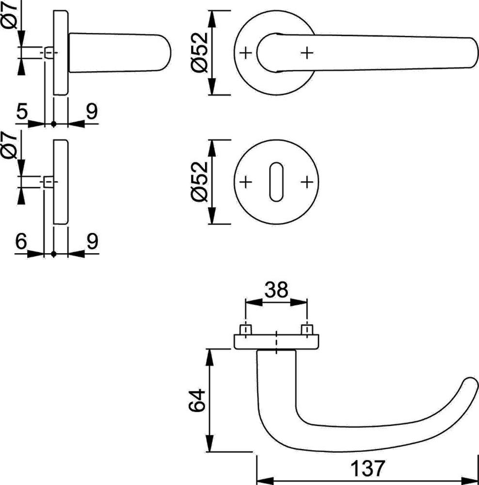Innentür-Rosetten-Garnitur nach DIN EN 1906 (Gebrauchs-Kategorie Klasse 3) · Türgriffe mit Schnellstift-Verbindung (mit 8 mm Vollstift) für Türstärke 37 - 42 mm · Rosette mit Kunststoff-Unterkonstruktion, Rückholfeder und Stütznocken · Befestigung verdeckt, durchgehend · wechselseitig inkl. Mehrzweckschrauben · Anschlagrichtung DIN links / rechts