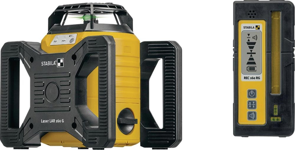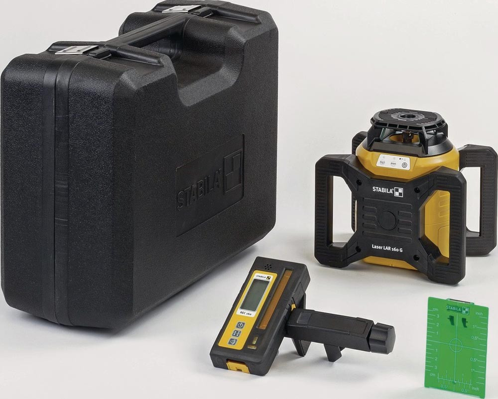 vollautomatischer, motorgesteuerter Rotationslaser – schnelle Selbstnivellierung innerhalb von 20 Sekunden · STABILA GREENBEAM-Technologie für bessere Sichtbarkeit des rotierenden Laserstrahls – grüne Laserstrahlen sind für das menschliche Auge um ein 4-faches sichtbarer als rote Strahlen · vier Laserfunktionen für einen vielseitigen Einsatz – horizontale und vertikale Rotation, Lotfunktion und rechter Winkel (90°) im Vertikalbetrieb · staub- und wasserdicht · stoßabsorbierender STABILA Softgrip-Mantel schützt vor Schlägen – die Laseroptik ist zusätzlich durch den stabilen Gehäusekopf geschützt · einfache Bedienung über drei Bedienknöpfe – Ein/Aus, Tiltmodus, Manueller Modus · Batterie-Schublade – leichter Wechsel auch direkt auf dem Stativ · großer Arbeitsbereich mit Set-Receiver REC 160 RG – bis zu 600 m Durchmesser · zwei im Gehäuse integrierte 5/8“-Gewinde · Zielplatte mit Magnethalterung und Fadenkreuz · Einsatzgebiete: Layout-Arbeiten, Setzen von Trennwänden und Abhängen von Decken, Elektroinstallationsarbeiten – Steckdosen, Schalter und Kabelkanäle horizontal und vertikal zueinander ausrichten, Installationsarbeiten im Industriebau – Einmessen der Ebenen und Ermitteln von Fluchten für den Verlauf von Leitungen und Rohren, Industriemontage – Einmessen und Ausrichten von Regalsystemen in Logistikbereichen · Stativaufnahme 2 x 5/8 ″