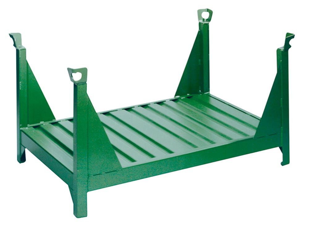 ∙ Rungengestelle ∙ Robuste Stahlblechkonstruktion · Seitenwände werden durch Rundsicken versteift · Vier angeschweißte Fangecken (6 mm stark) zum Stapeln ∙ Boden 2 mm stark mit Rundsicken versteift ∙ Füße durch Knotenbleche gestützt ∙ Unterfahrhöhe 100 mm