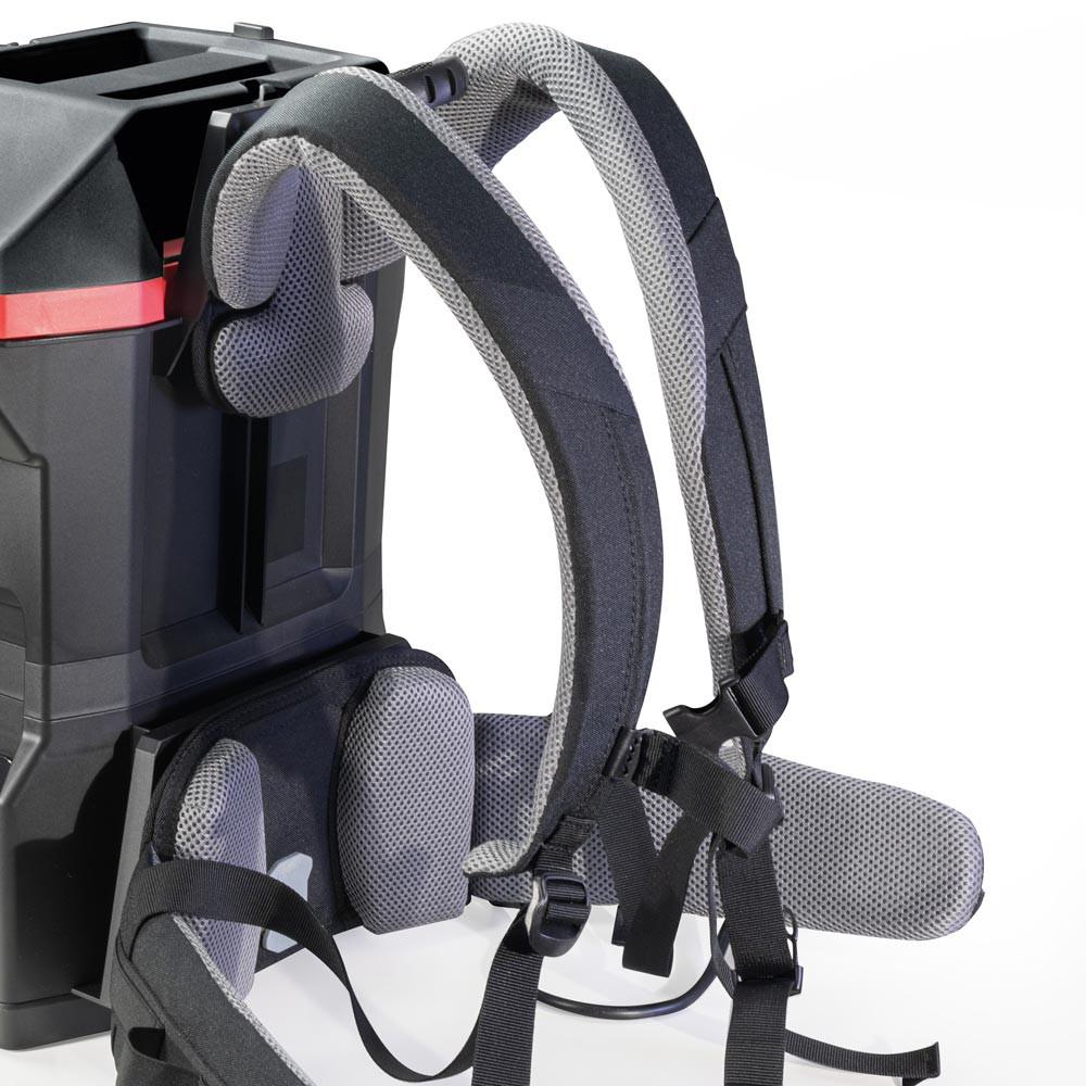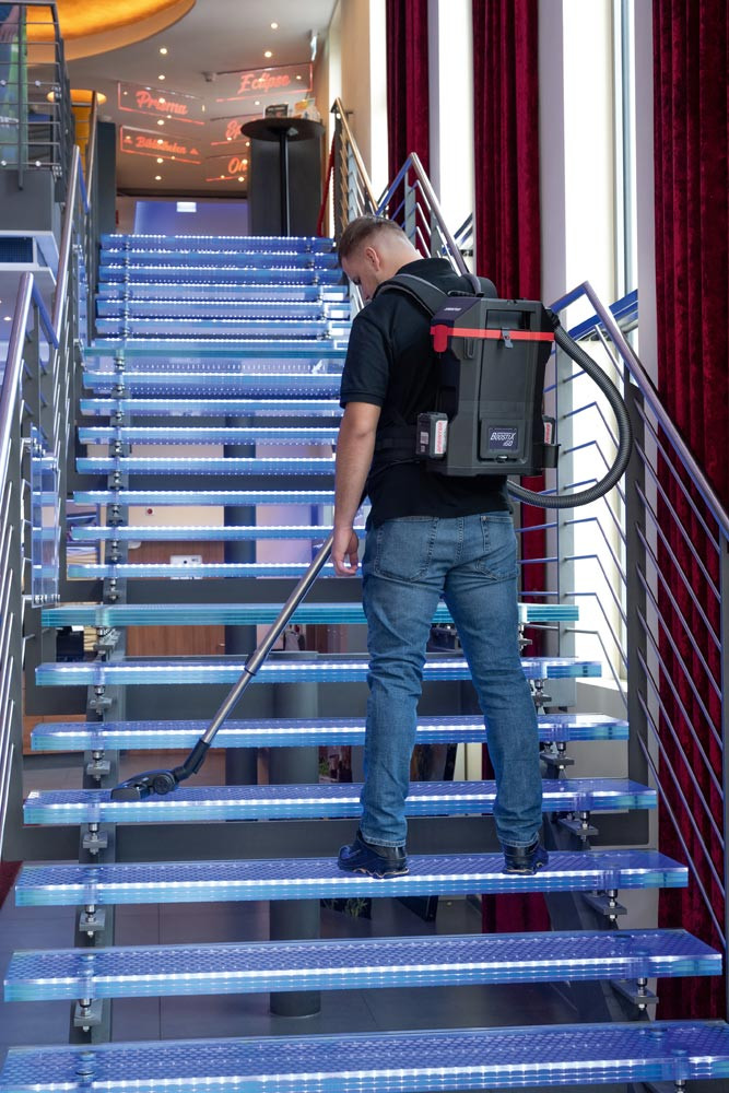Kabelloser Rucksacksauger mit äußerst niedrigem Gerätegewicht von nur 4,4 kg ∙ Mit bürstenlosem 300 Watt EC-Motor ∙ Mit einer Laufzeit von bis zu 90 Minuten eignet sich das Gerät ideal für lange Arbeitseinsätze in beengten oder schwer zugänglichen Bereichen wie öffentlichen Verkehrsmitteln, Kino- und Theatersälen oder Treppenhäusern ∙ Dreifaches HEPA 13-Filtersystem sorgt für eine saubere Ausblasluft, geeignet für Gesundheitswesen und Kindergärten