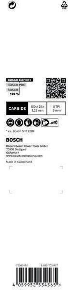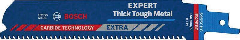 Bosch Carbide Technologie für langlebiges Schneiden von dickem, zähem Metall · die aus Hartmetall bestehenden Zähne werden auf ein besonders robustes, breites Blatt aus Stahl mit hoher Materialstärke geschweißt – perfekt für gerade Schnitte und Widerstandsfähigkeit · passend für alle S-Schaft-Säbelsägen