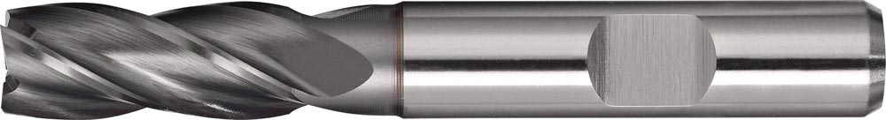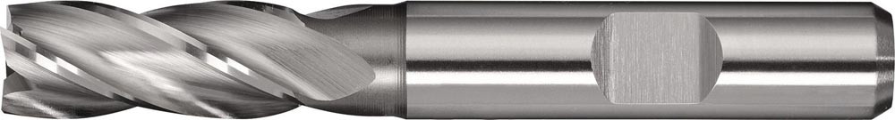 HSS-Co8 · DIN 844 · Typ N · Vierschneider · kurz · Zentrumschnitt · Zylinderschaft mit Mitnahmefläche · rechtsschneidend · zum Fräsen von Werkstoffen mit geringer und mittlerer Festigkeit bis ca. 800 N/mm² mit unbeschichtetem Werkzeug und 1000 N/mm² mit beschichtetem Werkzeug