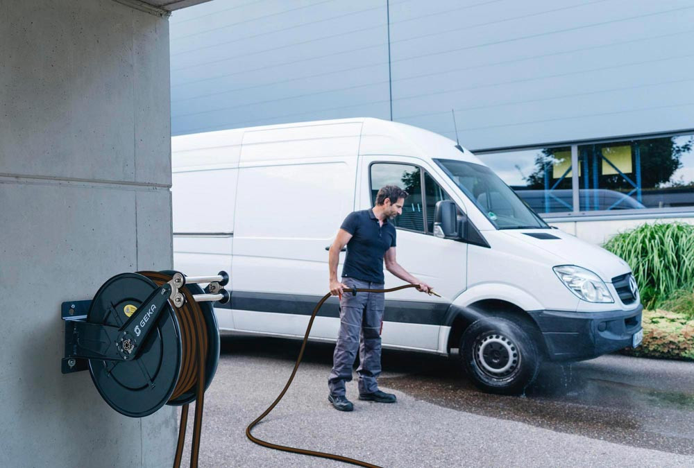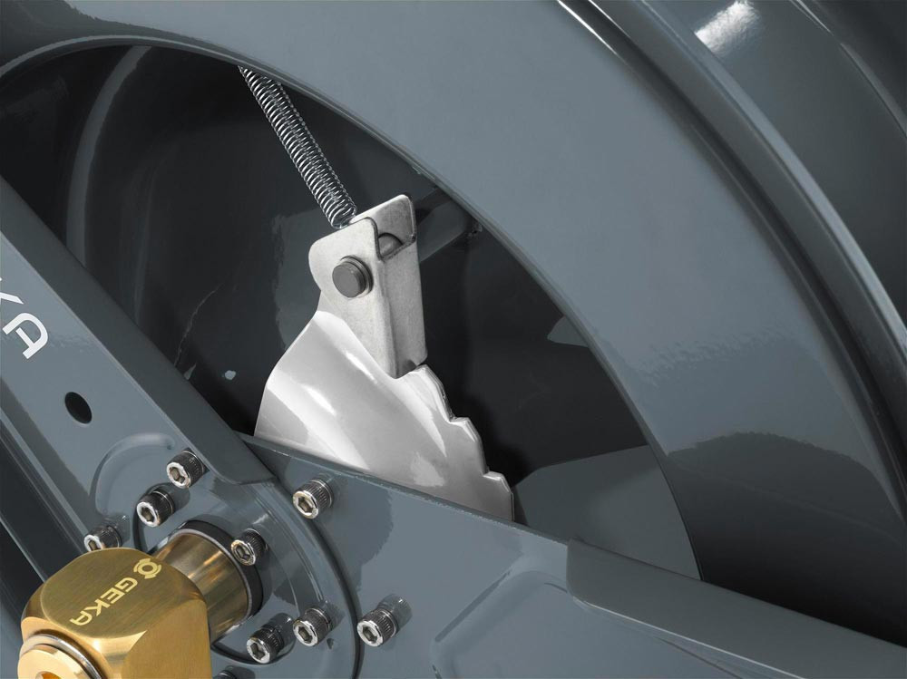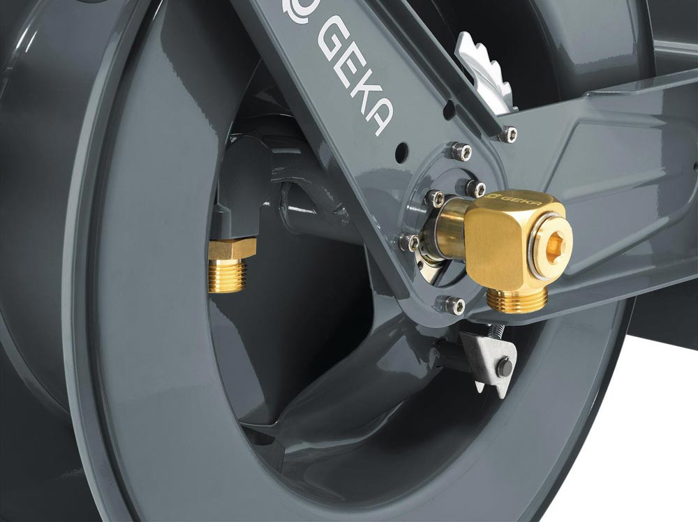 automatischer Rückzug des Schlauchs · schrittweise Arretierung aus der Distanz durch Zug am Schlauch möglich · geeignet für Wasser · mit Schlauchschutz und Schlauchstopper · mit GEKA® plus Winkeldreharmatur 90° aus Messing