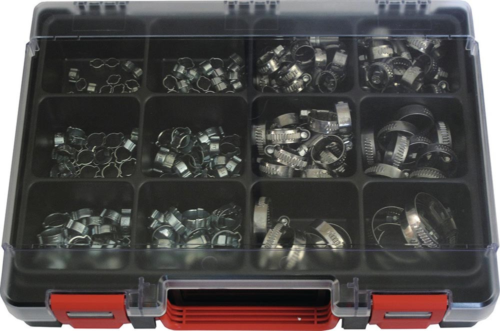 Sortimentsbox 326 x 241 x 57 mm · reduzierte Bestückung · 175 x 2-Ohr Schlauchklemmen, 82 x Schlauchschellen Schneckengewindeausführung · handliche Kunststoff-Sortimentsbox mit reduzierter Bestückung · beinhaltet die gängigsten Artikel unserer Schlauchklemmen und Schlauchschellen