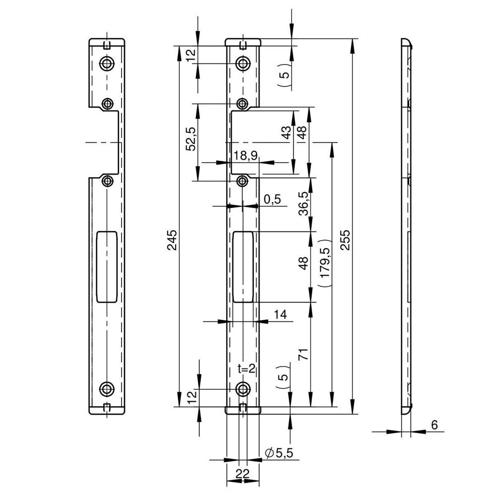 U-Schließblech Falle und Riegel für Rohrrahmentüren E-Öffner, DIN lrechts, 245x22x6mm· Edelstahl matt gebürstet