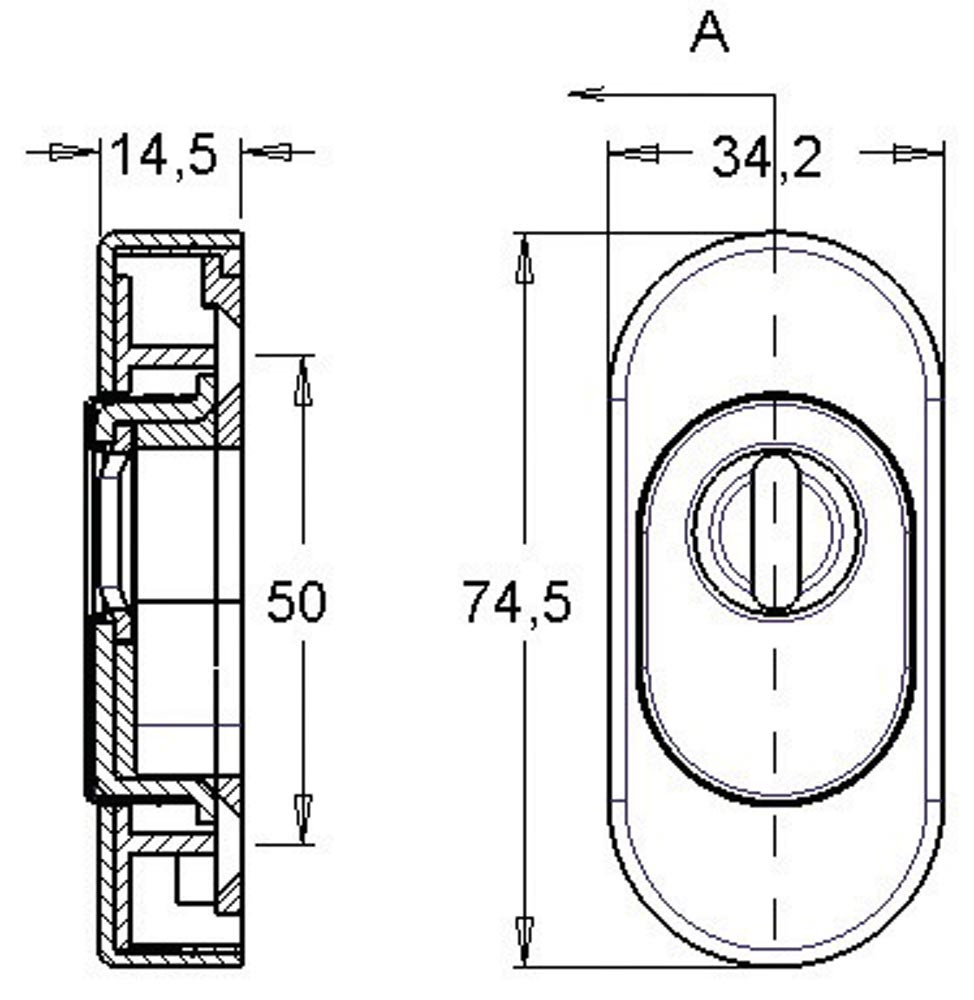 Schlüsselrosette zum Aufschieben für Rahmentüren · Lochung PZ mit Ziehschutz · für Zylinderüberstände von 11-14 mm · Stärke 14,5 mm · Höhe 75 mm · Breite 34 mm · unsichtbare Verschraubung · Lieferung ohne Schrauben