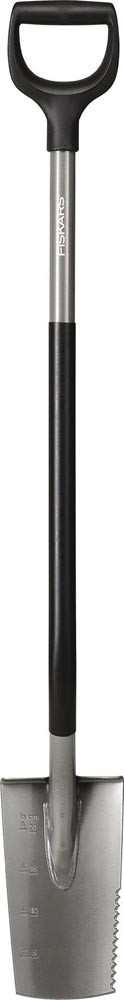 schmales Blatt 15,3 cm · Länge 123 cm · mit Sägezahnkante zum Durchstechen von Wurzeln und Graben in steiniger Erde · einsetzbar als Drainage-Spaten · D-Griff · Schaftwinkel aus Stahl mit Kunstoff-Umhüllung · geschweißte Verbindung zwischen Schaft und Blatt besitzt der Spaten ein hohe Robustheit und Langlebigkeit