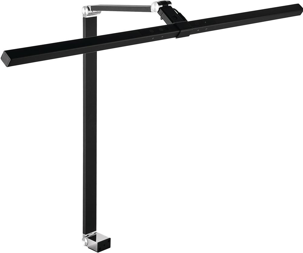 Aluminium/Kunststoff · mit Tischklemme · mit Reflektor 800 mm, über 3 Gelenke individuell verstellbar · Armlänge oben 175 mm - unten 480 mm, Höhe max. 720 mm · Bedienfeld am Leuchtenkopf (Touch-Funktion) · mit Lichtsensor (automatische Anpassung der Lichtintensität zur Umgebung), leuchtet den Arbeitsplatz vor dem Monitor perfekt aus · Betriebsspannung 230 V · Lichtfarbe 3.000/4.000 Kelvin - neutralweiß, 6.000 Kelvin tageslichtweiß · Lichtstrom 700 - 750 Lumen ∙ Lebensdauer 30.000 Stunden · gewichteter Energieverbrauch 11 kWh/1000h · Effizienzklasse F (Spektrum A bis G) · diese Leuchte enthält eingebaute LED-Lampen · die Lampen können nicht ausgetauscht werden