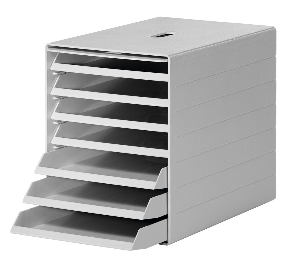 Polystyrol ∙ ideal zur Aufbewahrung von Unterlagen bis Format C4 ∙ mit versenkbarer Frontklappe ∙ Dokumente werden durch die Frontplatte vor Staub geschützt ∙ mit 7 Schubladen ∙ stapelbar · H 322 x B 250 x T 365 mm