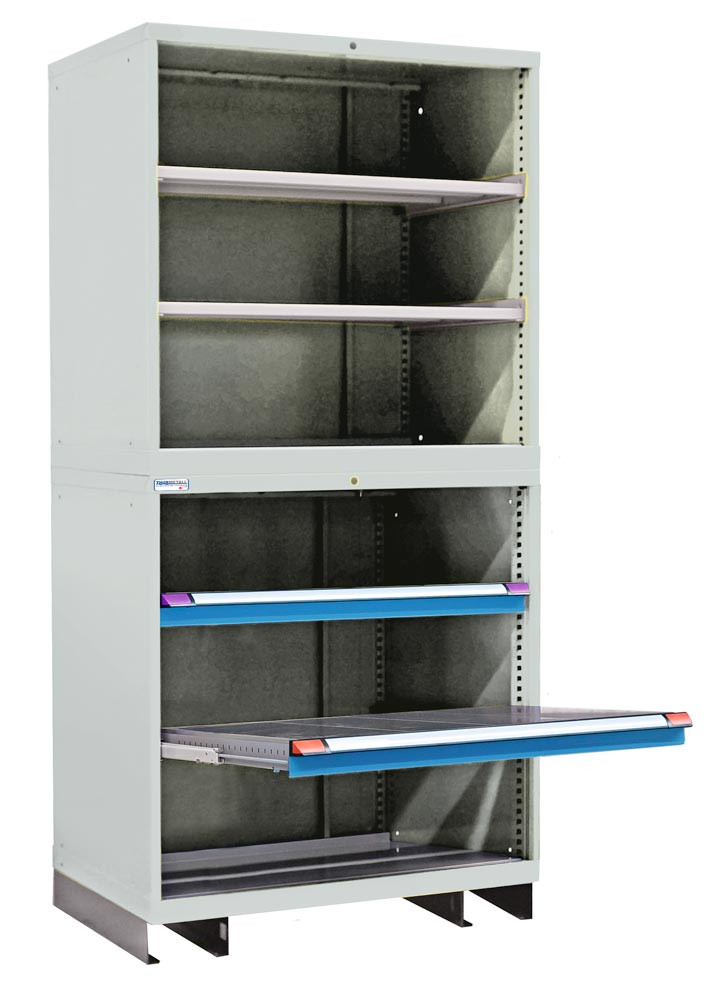 ∙ Modularer Aufbau, problemlos erweiterbar ∙ Schrankgehäuse 2-teilig fest verschraubt ∙ Hohe Belastbarkeit bis 4000 kg bei gleichmäßig verteilter Flächenlast ∙ Hohe Mobilität durch integrierten Hubwagensockel ∙ Farbe Korpus / Front RAL 7035 lichtgrau / RAL 5012 lichtblau