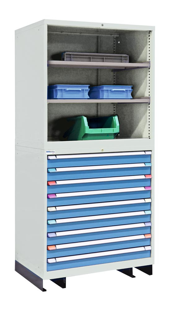Schubladenregal, Grundfeld, 2 Verstellböden, 9 Schubladen, Traglast je 75 kg, Sockel, BxTxH 805x695x2100 mm, RAL 7035/5012 EP537504