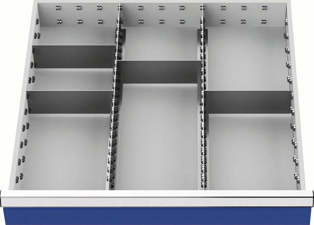 Metalleinteilung für Fronthöhe 150 mm · für Schubladen-Innenmaße B 600 x T 600 mm · 2 Längstrennwände · 4 Quertrennwände