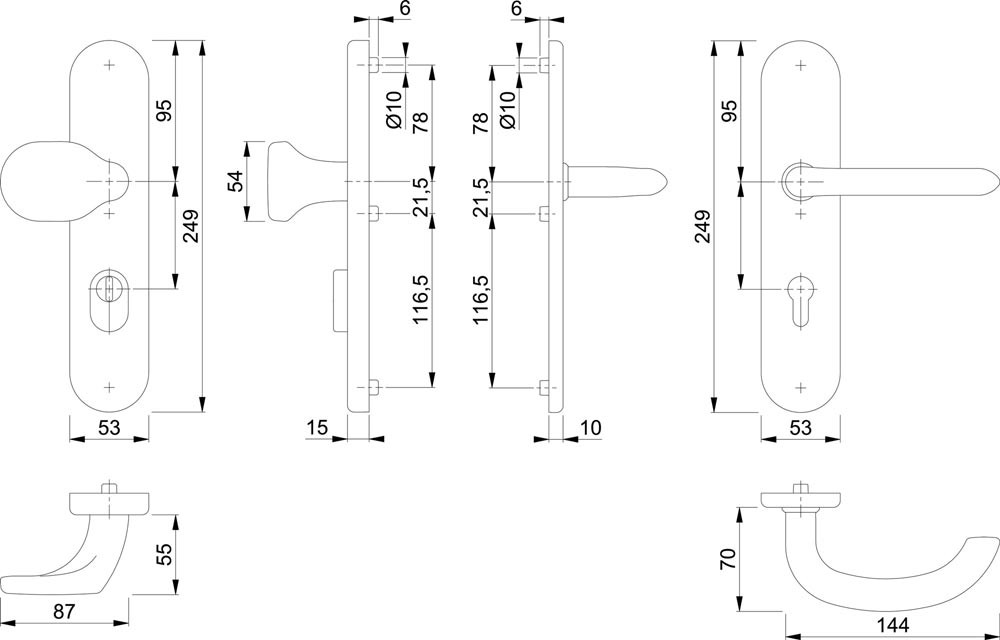Edelstahl-Schutz-Langschild-Garnitur mit Zylinderabdeckung für Außen-/Wohnungsabschluss-Türen · geprüft nach DIN EN 1906: 37-0142A (SK2), zertifiziert nach DIN 18257 ES1, Objekt-Garnitur (Gebrauchs-Kategorie 3) · Lagerung: Türgriffe lose (Wechselgarnitur: außen gekröpfter Knopf fest, ummontierbar), Rückholfeder rechts/links verwendbar, wartungsfreies Gleitlager · Verbindung: HOPPE-Schnellstift mit HOPPE-Vollstift (Drückergrt., Stift-/Lochteil) / HOPPE-FDW-Vollstift (Wechselgrt., Lochteil) · Zylinderabdeckung: gehärteter Stahl, für vorstehende Zylinderlänge 10-18 mm · Unterkonstruktion: außen Stahl, innen Zamak, Stütznocken · Befestigung: innen sichtbar, durchgehend, Gewindeschrauben M6 · Anschlagrichtung DIN links / rechts · Lochung PZ · Widerstandsklasse ES 1