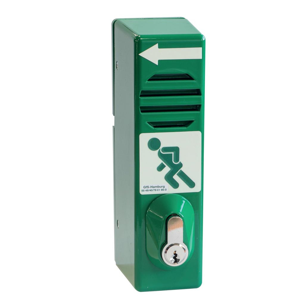 Der verantwortliche Hausmeister, Techniker etc. kann den Türwächter nur mit einem Schlüssel wieder zurückstellen und damit den Alarm beenden. Der Türwächter ist für rechte oder linke Türen verwendbar. Piktogramme auf dem Türwächter und auf der Tür weisen darauf hin, in welche Richtung er geschwenkt werden muss. Die Schwenkrichtung wird mittels eines Kerbstiftes kundenseitig eingestellt (im Lieferumfang enthalten).