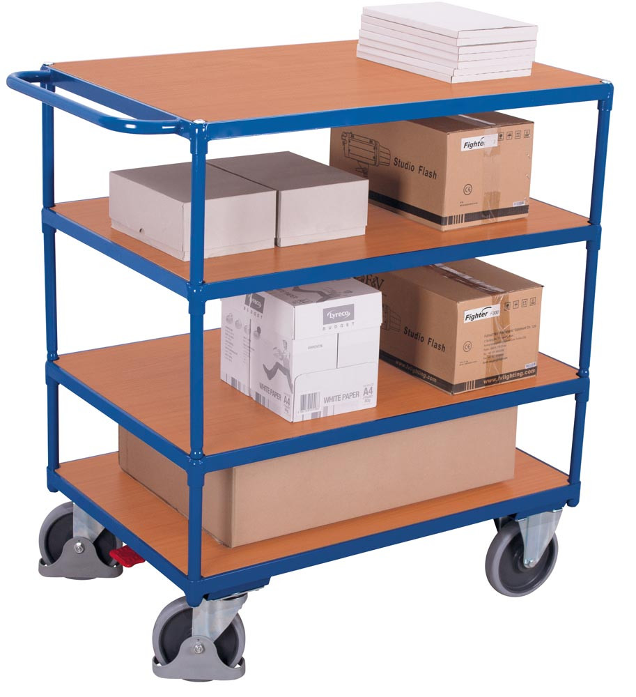 Schwerer Tischwagen, 4 Ladeflächen LxB 1000x700 mm, Außenmaße LxBxH 1190x700x1235 mm, Traglast 500 kg, RAL 5010 enzianblau