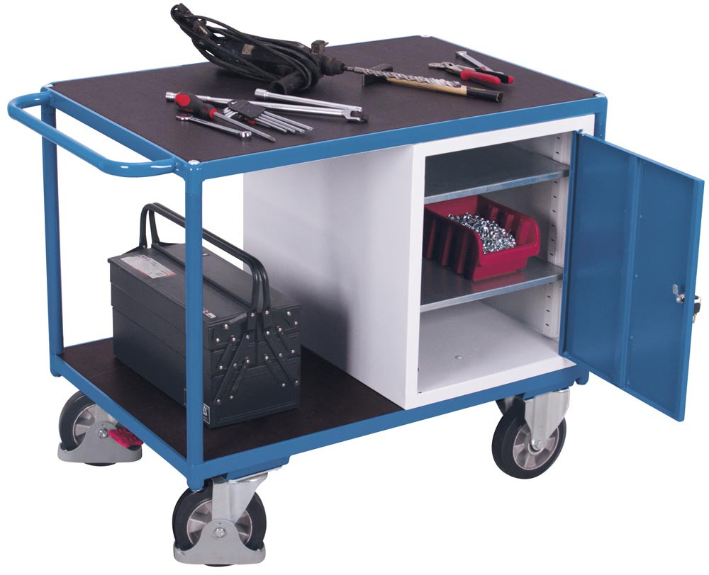 Schwerlast-Tischwagen, 2 Ladeflächen LxB 1260x800 mm, Stahlschrank, Außenmaße LxBxH 1390x800x930 mm, Traglast 1000 kg