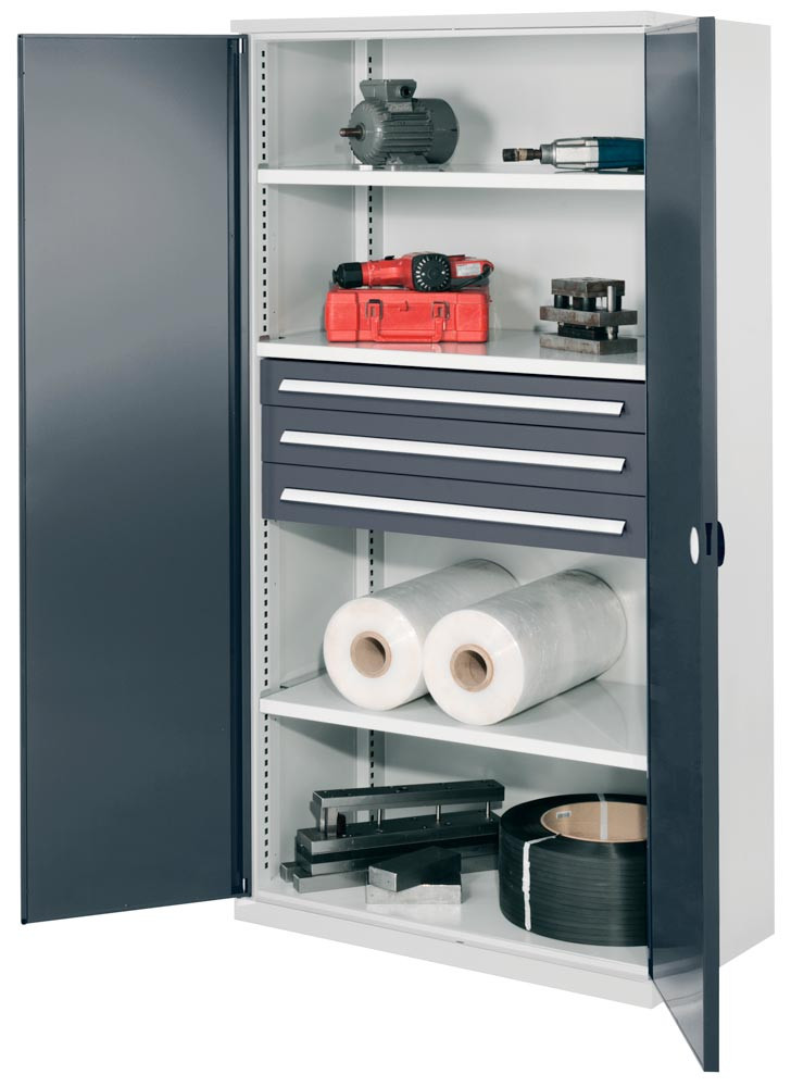 Schwerlastschrank, Vollblechtüren, 3 Fachböden, 3 Schubl. 1x100, 2x125 mm, BxTxH 1000x600x1950 mm, RAL 7035/7016