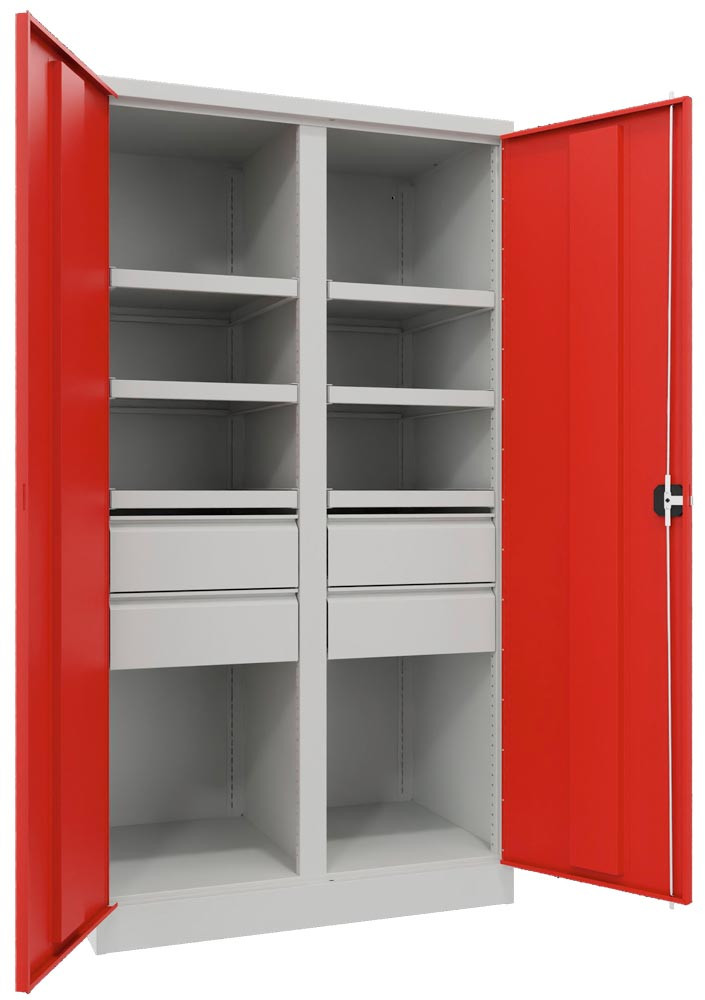 Schwerlastschrank, Vollblechtüren, ohne Trennwand, 3 Böden, 200 kg Traglast, 2 Schubl. 175 mm, BxTxH 1040x630x1950 mm, RAL 5010 EP562207