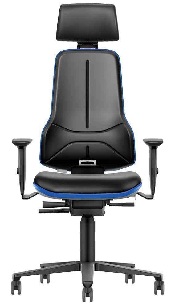· Gefertigt nach DIN 68877 · Robuste und sichere Bauweise · Schwerlastbauteile: Gestell, Rollen, Mechanik, Gasdruckfeder, Fußkreuz und Polster · XXL - Gewichtsregulierung von 80 bis 180 kg · Schwerlast - Armlehnen mit größerer Breite · Sitztiefenverstellung · Rückenlehnenhöhenverstellung · Fußkreuz aus Aluminium · Neigbare und höhenverstellbare Kopfstütze · Flexbandfarbe in blau · Ergonomisch geformte Sitzfläche und Rückenlehne
