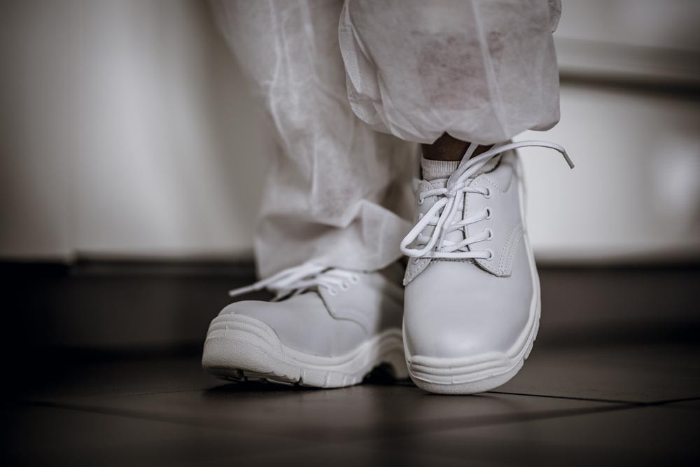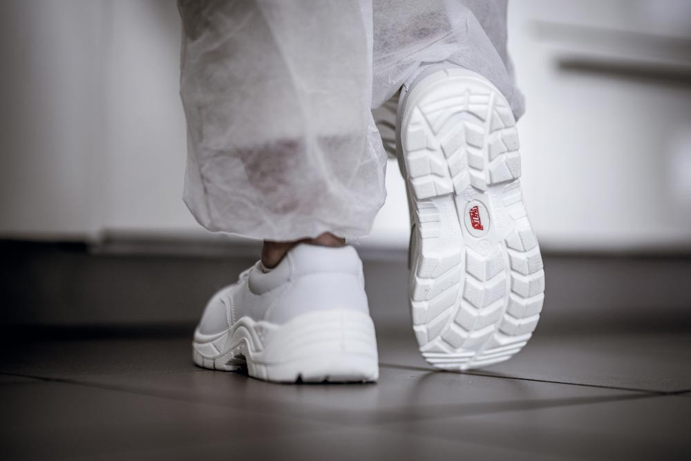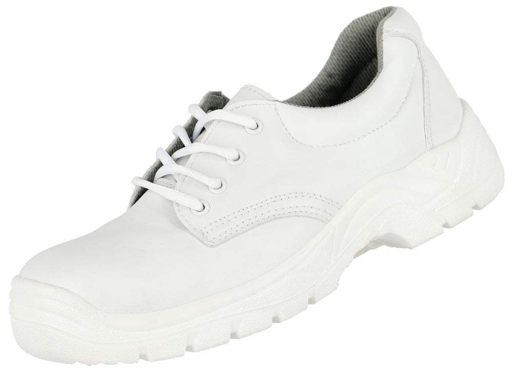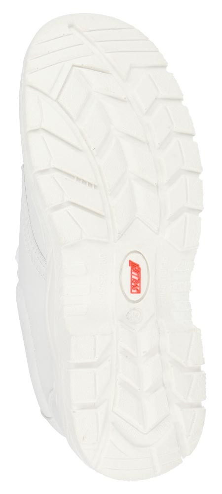 Nach EN ISO 20345, Sicherheitsklasse S2 SRC ∙ Zehenkappe aus Stahl ∙ Obermaterial aus Kunstleder ∙ Weiße, widerstandsfähige PU/PU-Laufsohle ∙ Ergonomisch geformte Einlegesohle ∙ Weite 11 ∙ Farbe weiß