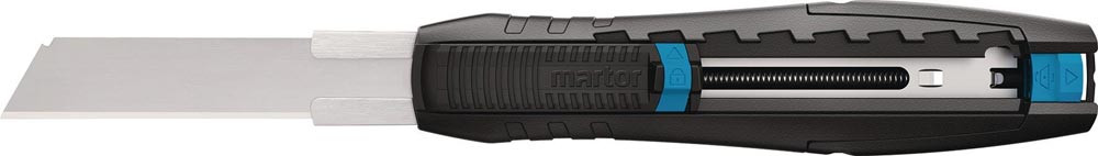 ein Sicherheitsmesser, das auch als Cuttermesser performt · mit einem automatischen Klingenrückzug, um Schnittverletzungen zu vermeiden · bestimmte Schneidanwendungen gehen aber mit fixierter Klinge besser von der Hand, darunter auch der Sägeschnitt · dafür können Sie optional die Klinge in sieben verschiedenen Stufen arretieren · glasfaserverstärkter Kunststoff · für Rechts- und Linkshänder